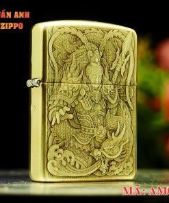 Điểm nhấn đặc biệt của chiếc Zippo này chính là hình khắc 3D ở một mặt, mô tả Lữ Bố, một trong những vị tướng lừng danh và mạnh mẽ nhất trong lịch sử Trung Hoa. Hình ảnh Lữ Bố với vóc dáng oai hùng và vũ khí đặc trưng, được khắc họa sống động và chi tiết trên nền đồng nguyên khối, thể hiện sự dũng mãnh và tinh thần chiến đấu bất khuất. Hình khắc 3D không chỉ mang lại cảm giác chân thực mà còn tạo nên một tác phẩm nghệ thuật đẳng cấp.