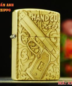 Mặt trước của Zippo được chạm khắc hình khẩu súng lục tinh xảo, tượng trưng cho sức mạnh và sự quyết đoán. Khẩu súng lục được khắc chi tiết, với từng bộ phận sắc nét, tạo nên cảm giác mạnh mẽ và đầy uy quyền. Bao quanh khẩu súng là những hoa văn cổ điển, tinh tế, làm tăng thêm sự sang trọng và độc đáo cho sản phẩm.